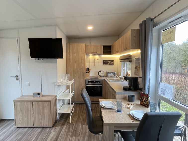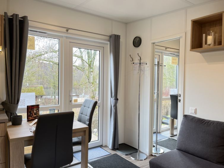 "Tanjas Tiny Haus", 2-room mobile home 25 m2, on the ground floor. Object suitable for 2 adults + 2 children. Cosy furnishings: living/sleeping room with 1 double sofabed (120 cm, length 200 cm), satellite TV. Exit to the terrace. 1 room with 1 french bed (140 cm, length 200 cm). Open kitchen (2 induction hot plates, toaster, kettle, electric coffee machine).