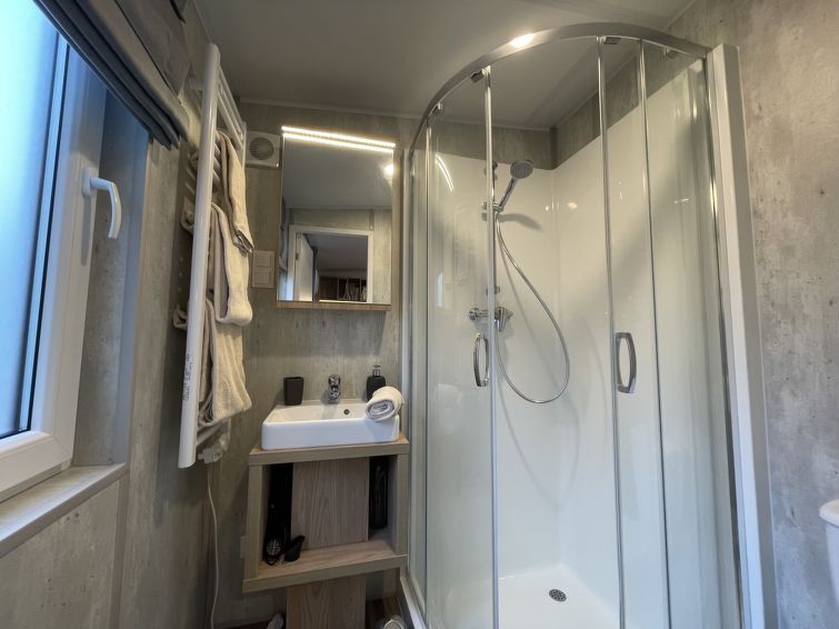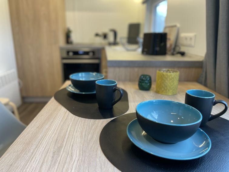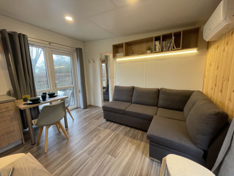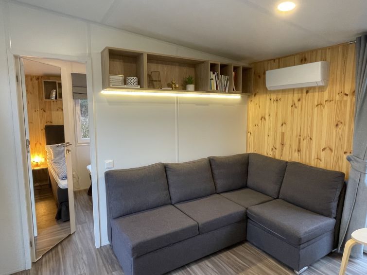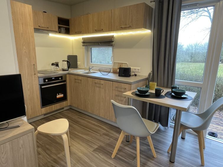 "Tinyhaus am See", 2-room mobile home 25 m2, on the ground floor. Object suitable for 2 adults + 2 children. Cosy furnishings: living/sleeping room with 1 double sofabed and satellite TV. Exit to the terrace. 1 room with 1 french bed (140 cm, length 200 cm). Open kitchen (2 induction hot plates, toaster, kettle, microwave).