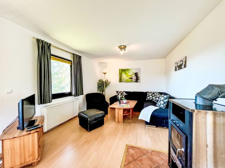 "Hänsel & Gretel im Kellerwald", 6-room house 140 m2 on 2 levels. Spacious and bright, beautiful furnishings: living/dining room with Scandinavian wood stove, dining table, satellite TV and flat screen. Exit to the garden. 1 double bedroom. 1 room with 2 beds. Open kitchen (4 hot plates, oven, dishwasher, toaster, kettle, microwave, freezer, electric coffee machine).