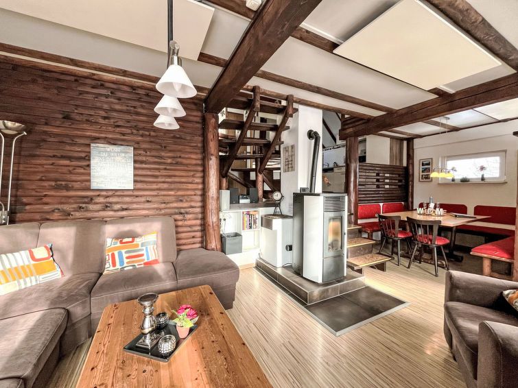 "Knusperhaus Gretel", 4-room house 75 m2 on 2 levels. Object suitable for 6 adults. Partly with sloping ceilings, cosy and wooden furniture furnishings: living/dining room with Scandinavian wood stove, dining nook and cable TV (flat screen), hi-fi system. Exit to the terrace, to the patio.