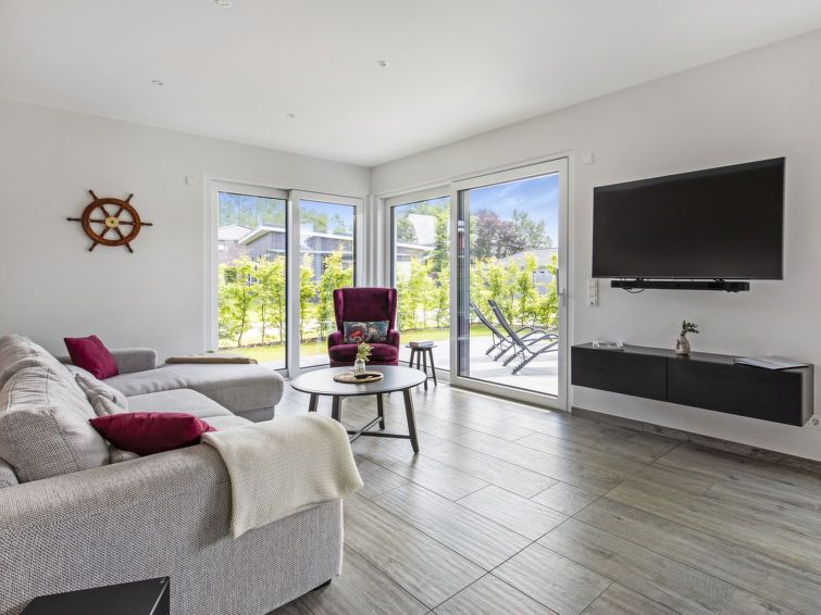 4-room apartment 96 m2. Spacious and bright, comfortable and modern furnishings: large living/dining room with satellite TV (flat screen). Exit to the garden. 2 rooms, each room with 1 double bed (180 cm, length 200 cm), satellite TV (flat screen). 1 room with 1 x 2 bunk beds (90 cm, length 200 cm).