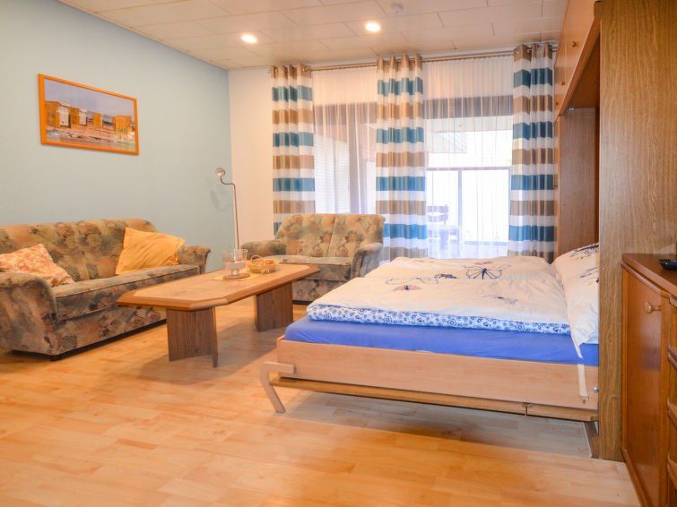 1-room apartment 30 m2, on the ground floor. Simple and practical furnishings: living/sleeping room with 1 double wall-trunk bed, satellite TV, radio and CD-player. Kitchenette (oven, microwave, electric coffee machine). Shower/WC. Small terrace. Please note: non-smokers only. Smoke alarm.