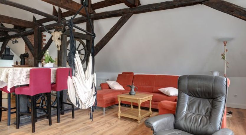 "Atelier an der Kirche", 2-room maisonette 130 m2 on 2 levels, on the top floor. Object suitable for 4 adults + 2 children. Spacious and bright, with sloping ceilings, comfortable and tasteful furnishings: 2nd upper floor: living/sleeping room with curtain with 1 double sofabed (200 cm, length 200 cm), 1 double bed, dining table, satellite TV and hi-fi system.