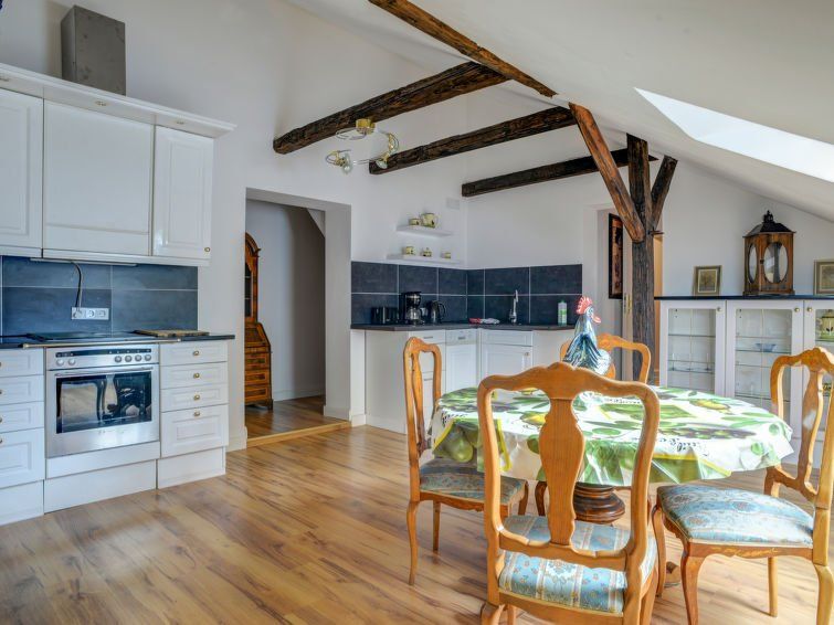 "Lounge an der Kirche", 1-room apartment 100 m2 on 1st floor. Bright, fully renovated in 2022, cosy and wooden furniture furnishings: living/sleeping room with sloping ceilings with 3 beds (90 cm, length 200 cm), flat screen. Open kitchen (oven, 4 ceramic glass hob hotplates, kettle, freezer, electric coffee machine) with dining table.