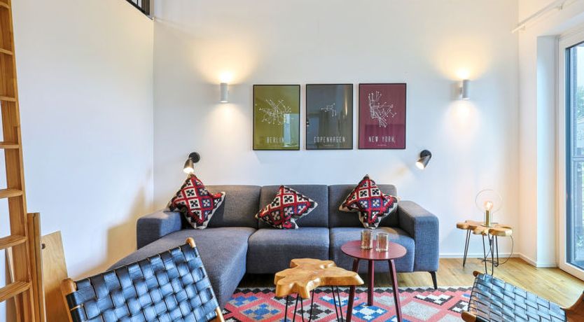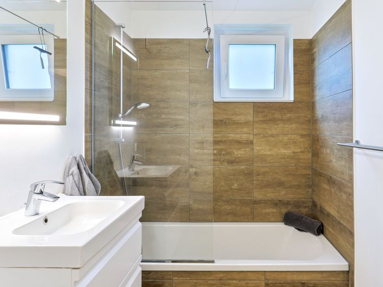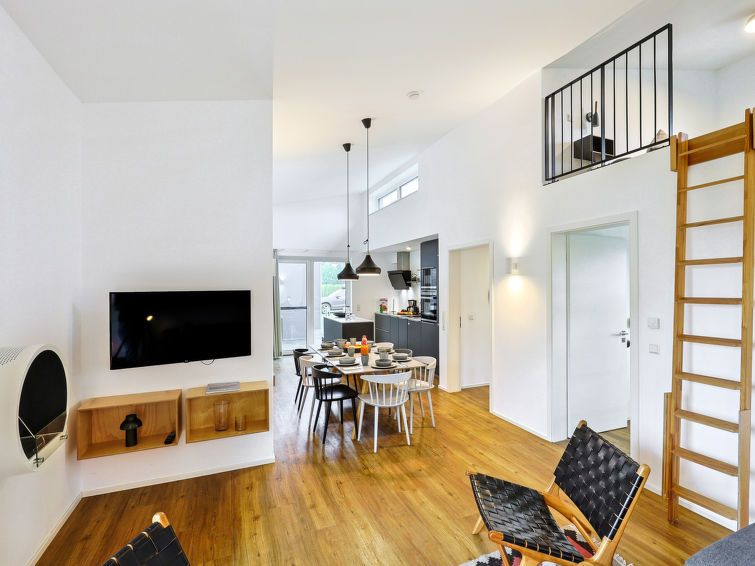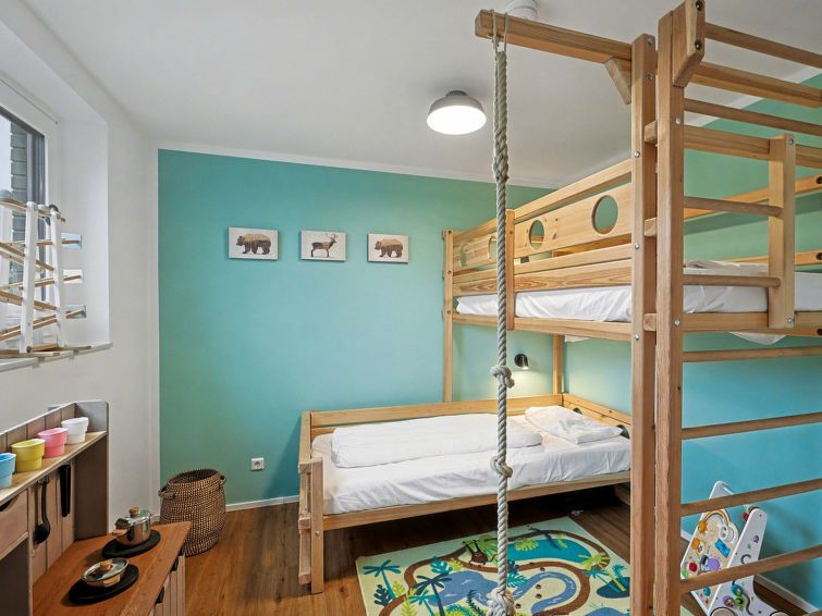 "Abenteuerland", 4-room house 98 m2 on 2 levels. Tasteful and cosy furnishings: living/dining room with satellite TV (flat screen). Exit to the terrace. 2 rooms, each room with 1 double bed (2 x 90 cm, length 200 cm). 1 room with 1 x 2 bunk beds (90 cm, length 200 cm). Kitchen-/living room (oven, dishwasher, 4 ceramic glass hob hotplates, toaster, kettle, microwave, electric coffee machine).