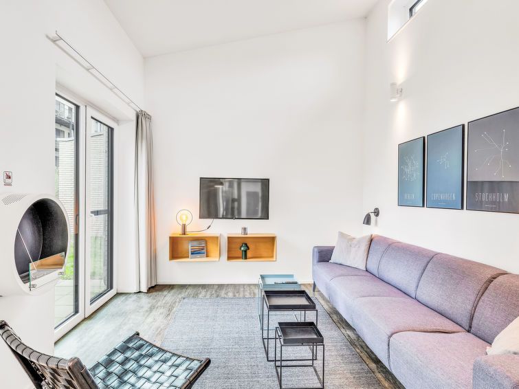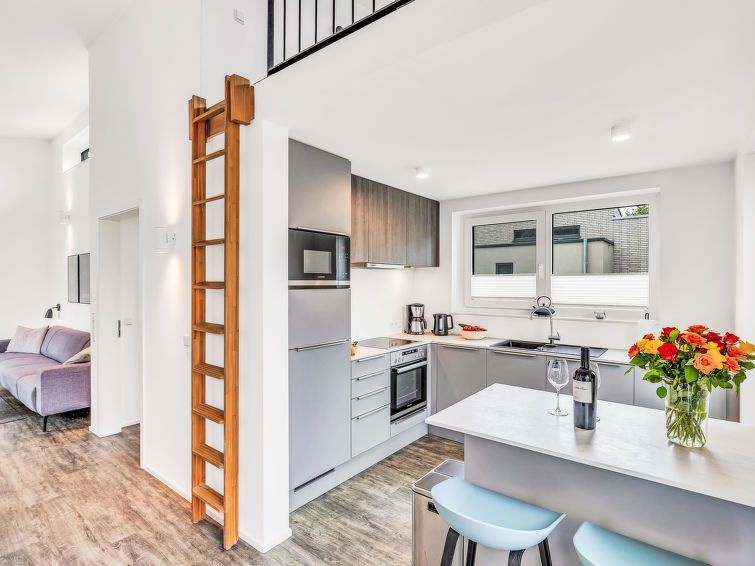 "Goldfisch", 3-room house 85 m2 on 2 levels. Tasteful and cosy furnishings: living/dining room with satellite TV (flat screen). Exit to the terrace. 2 rooms, each room with 1 double bed (2 x 90 cm, length 200 cm). Open kitchen (oven, dishwasher, 4 ceramic glass hob hotplates, toaster, kettle, microwave, electric coffee machine).