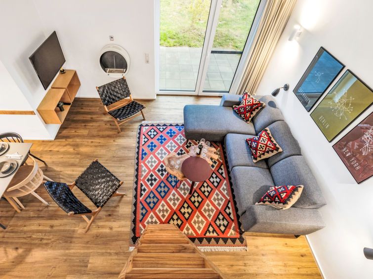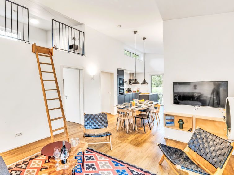 "Lichtspiel", 4-room house 98 m2 on 2 levels. Tasteful and cosy furnishings: living/dining room with satellite TV (flat screen). Exit to the terrace. 3 rooms, each room with 1 double bed (2 x 90 cm, length 200 cm). Kitchen-/living room (oven, dishwasher, 4 ceramic glass hob hotplates, toaster, kettle, microwave, electric coffee machine).