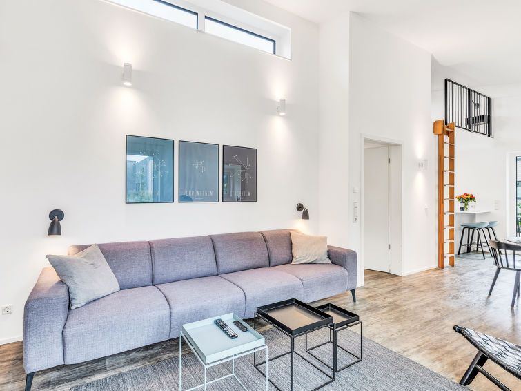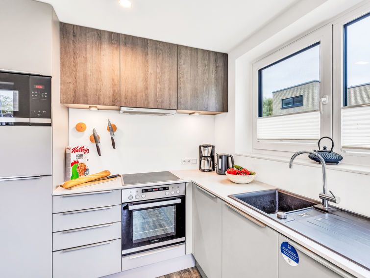 "Sonnenwelle", 3-room house 85 m2 on 2 levels. Tasteful and cosy furnishings: living/dining room with satellite TV (flat screen). Exit to the terrace. 2 rooms, each room with 1 double bed (2 x 90 cm, length 200 cm). Open kitchen (oven, dishwasher, 4 ceramic glass hob hotplates, toaster, kettle, microwave, electric coffee machine).