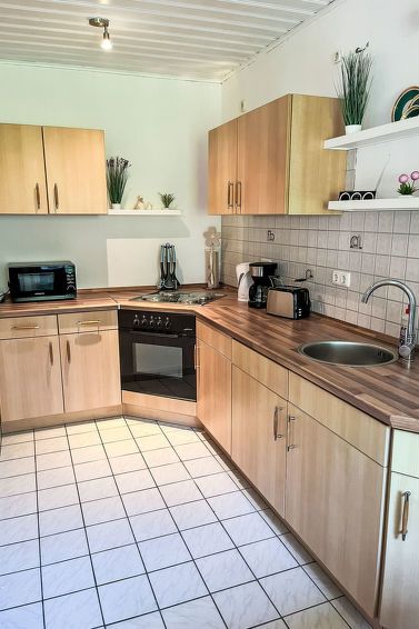 2-room apartment on the ground floor. Cosy furnishings: living/dining room with satellite TV (flat screen). Exit to the terrace. 1 room, without window with 1 bed (140 cm, length 200 cm). Open kitchen (4 hot plates, oven, toaster, kettle, microwave, electric coffee machine). Shower/WC.