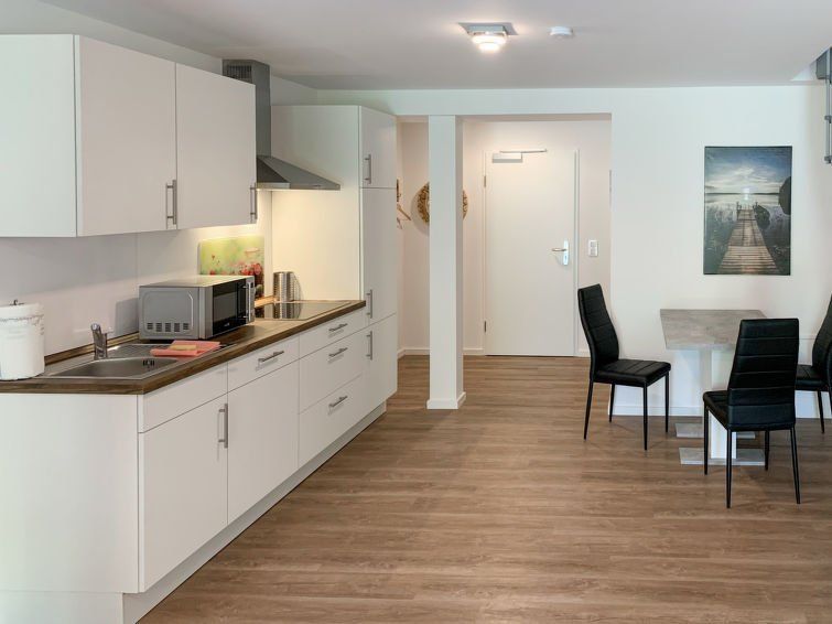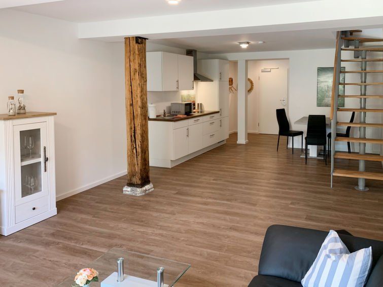 "Langeoog", 2-room apartment 70 m2 on 2 levels, on the ground floor. Tasteful and cosy furnishings: living/dining room with satellite TV (flat screen). Exit to the terrace. Kitchenette (dishwasher, 4 ceramic glass hob hotplates, toaster, kettle, microwave, electric coffee machine).