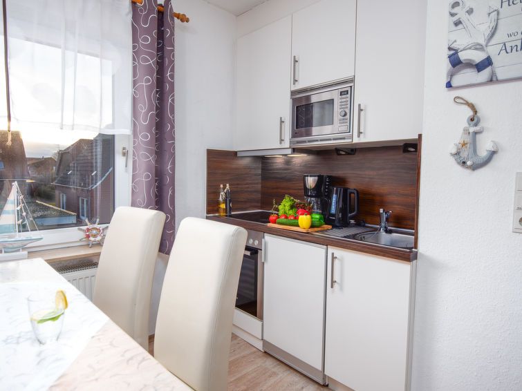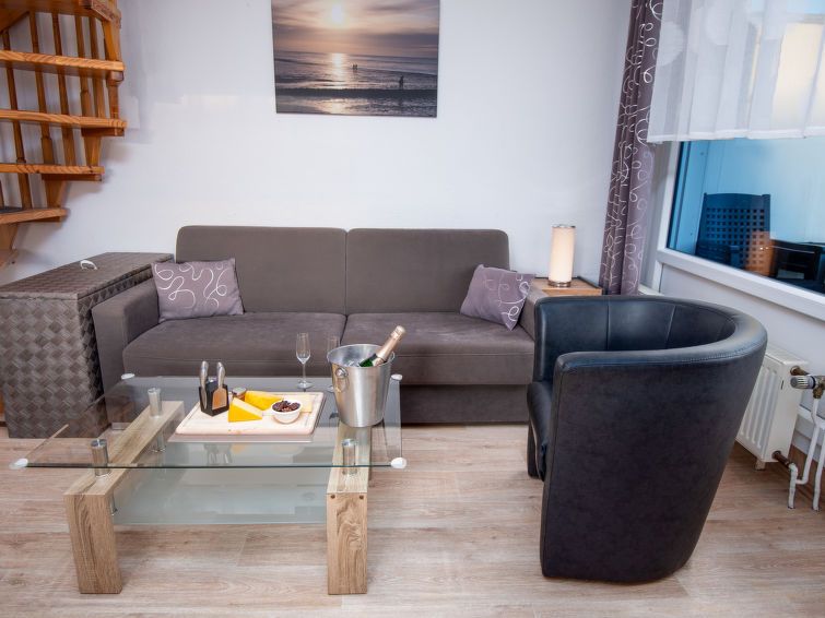 The location is really good, short distances to the town center, bakery, snack bar, Interhome, dyke/beach, etc. Overall, unfortunately, it's kind of getting old and could do with a decent color renovation + a new blind in the upper skylight, new curtains would look more modern and that Spice up the whole thing, since the furniture in the kitchen and living/dining room have already been modernized. We have the apartment with 2 people. used. I question the use of 4. as the attic room (double bed), which we didn't use, only has a mini cupboard niche and only sports bags can be transported via the space-saving staircase leading upstairs; medium-sized suitcases do not fit through. From my point of view (mother), the stairs are suitable for small children accompanied by adults, as they are quite narrow and steep. We have spent a great holiday and would be with 2 people. also come again.