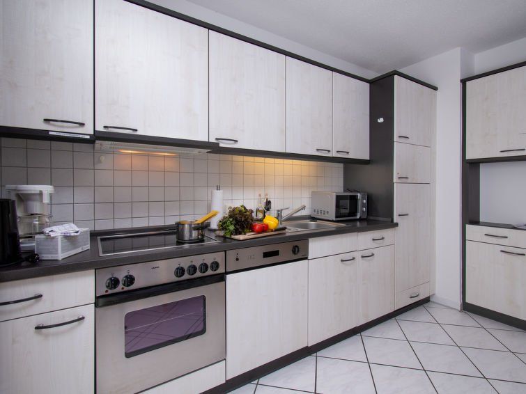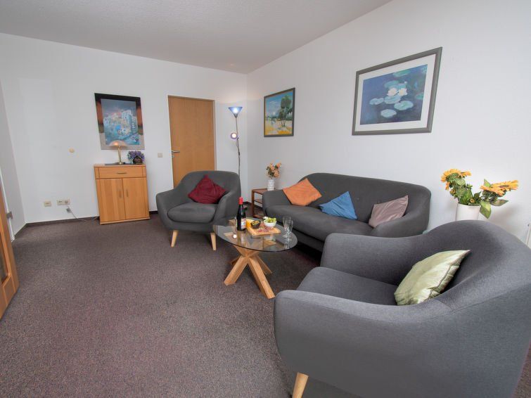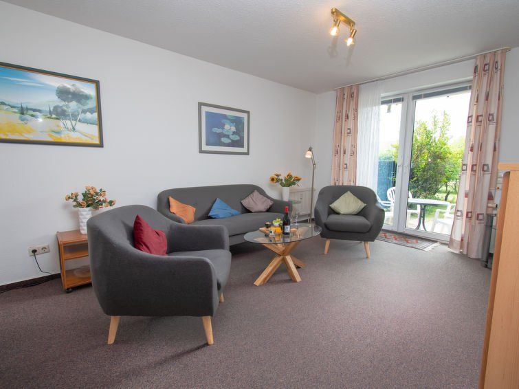 "Borkum", 2-room apartment 54 m2, on the ground floor. Spacious and bright: living room 17 m2 with satellite TV (flat screen), hi-fi system. 1 room 9 m2 with 1 double bed (2 x 90 cm, length 200 cm). Kitchen 10 m2 (oven, dishwasher, 4 ceramic glass hob hotplates, toaster, kettle, microwave, freezer, electric coffee machine) with dining table, radio.