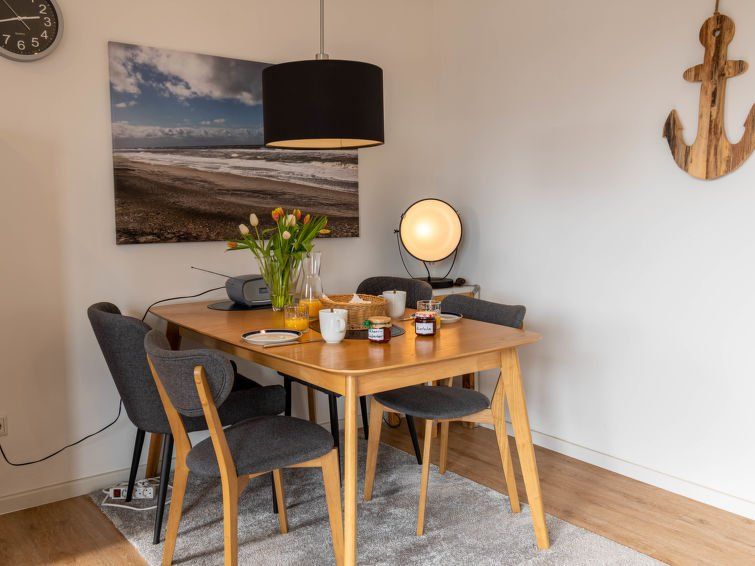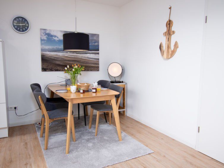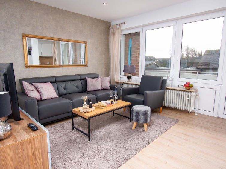 "Gezeiten", 3-room apartment 55 m2 on 1st floor. Tasteful furnishings: living/dining room 16 m2 with satellite TV (flat screen). Exit to the balcony. 1 room 8 m2 with 1 double bed (160 cm, length 200 cm), satellite TV (flat screen). 1 room 3 m2, without window with 1 bed (90 cm, length 180 cm).