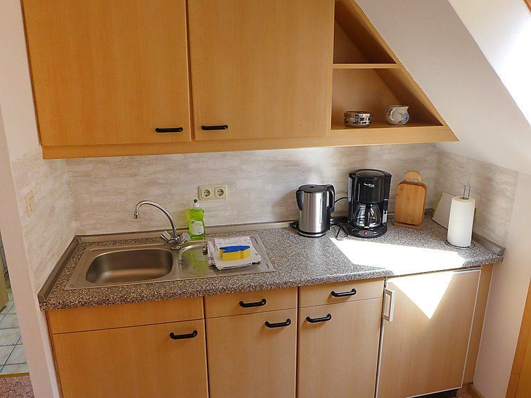 3-room apartment 80 m2, on the upper floor. With sloping ceilings: living room 14 m2 with satellite TV (flat screen). 2 rooms 15 m2, each room with 1 double bed (2 x 90 cm, length 200 cm). Kitchen (oven, 4 ceramic glass hob hotplates, electric coffee machine) with dining table. Shower/WC.