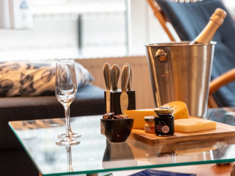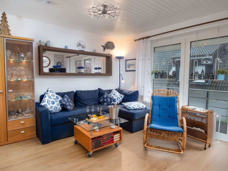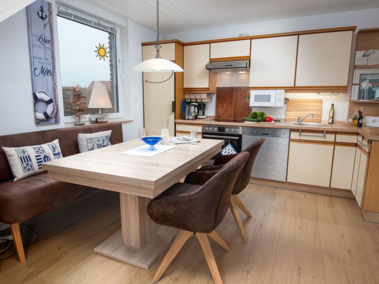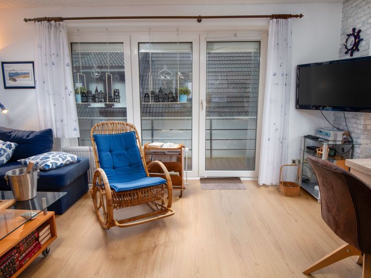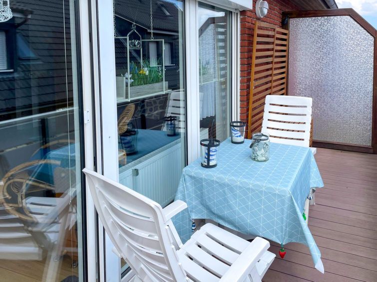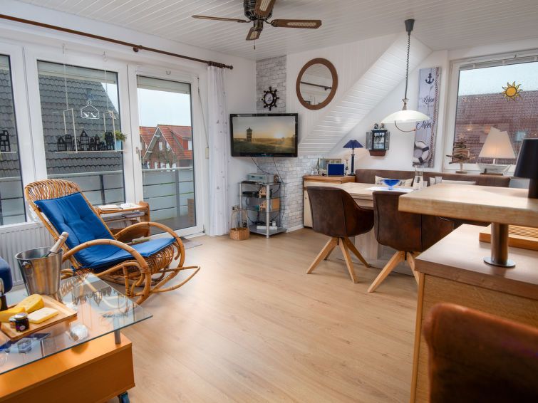 "Lüttje Mööv", 2-room apartment 38 m2, on the upper floor. Cosy furnishings: living/dining room with satellite TV (flat screen), radio. Exit to the balcony. 1 small room with 2 beds (90 cm, length 200 cm). Kitchenette (oven, dishwasher, 4 ceramic glass hob hotplates, toaster, kettle, microwave, electric coffee machine).