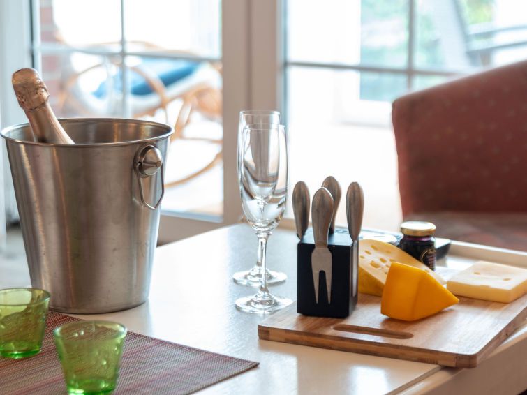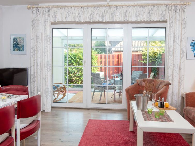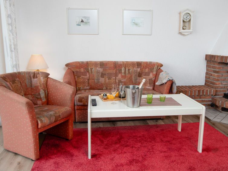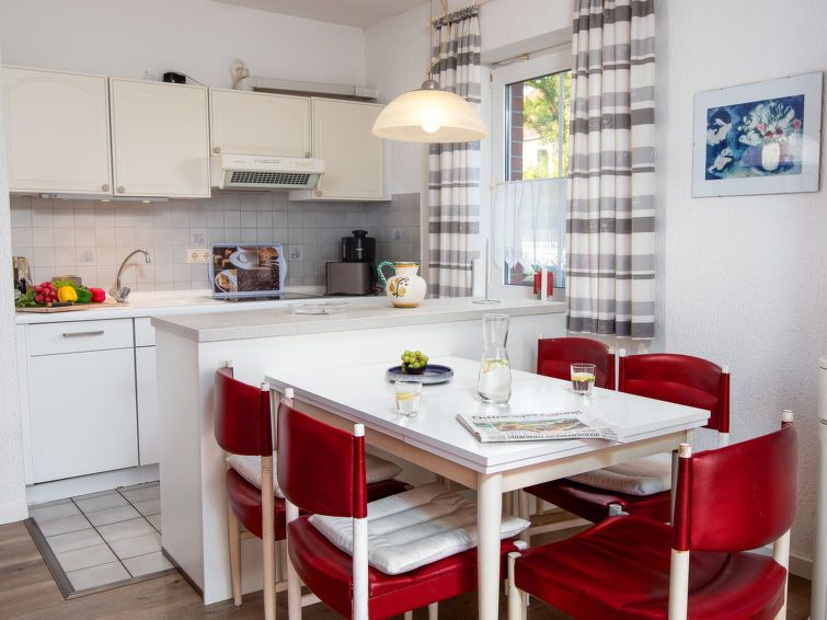 The apartment's layout is nice for two people. There's a conservatory. Unfortunately, the apartment is in dire need of renovation. The bathroom is completely unacceptable. It's truly worn. The shower cubicle has mold in the corners, etc., and the furniture is showing its age. The apartment's location is perfect, quiet, and close to the beach.