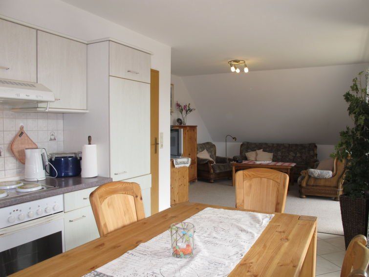 3-room apartment 80 m2, on the upper floor. Bright, with sloping ceilings, cosy and wooden furniture furnishings: living room with satellite TV, radio and CD-player. Exit to the balcony. 2 rooms, each room with 1 double bed. Open kitchen (4 hot plates, oven, dishwasher, toaster, kettle, microwave, electric coffee machine) with dining table.