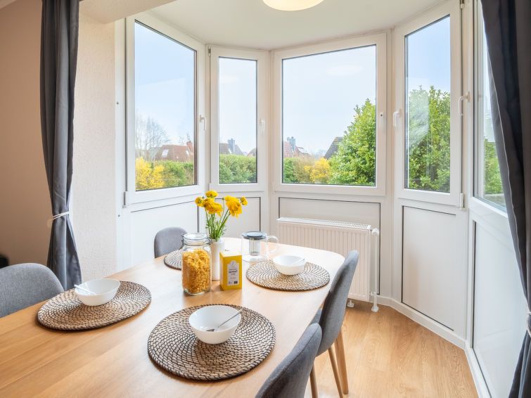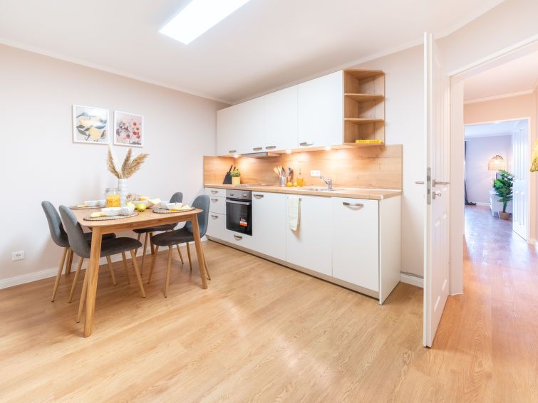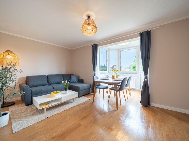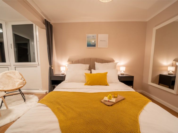 2-room apartment 38 to 44 m2. Bright, renovated in 2023, tasteful and cosy furnishings: living/sleeping room with 1 double sofabed (140 cm, length 200 cm), satellite TV (flat screen). Exit to the garden, to the balcony. 1 room with 1 double bed (180 cm, length 200 cm). Open kitchen (oven, dishwasher, 2 ceramic glass hob hotplates, toaster, kettle, electric coffee machine).