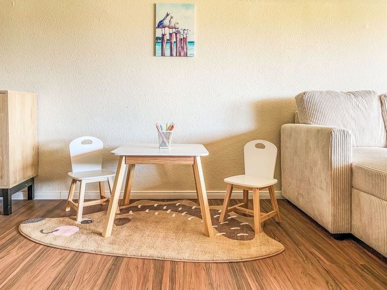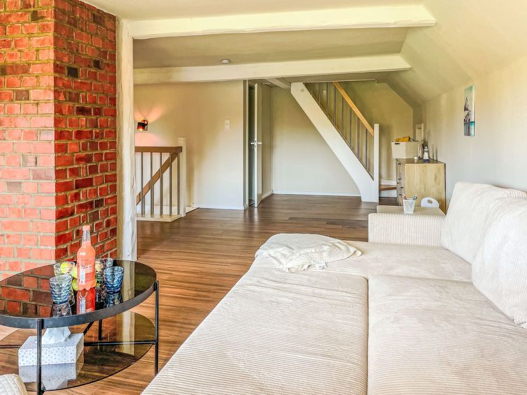 4-room semi-detached house 120 m2 on 2 levels. Spacious, partly with sloping ceilings, cosy and wooden furniture furnishings: entrance hall with Scandinavian wood stove. 2 rooms, each room with 1 double bed (180 cm, length 200 cm). Large, open kitchen (oven, dishwasher, 4 ceramic glass hob hotplates, toaster, kettle, freezer, electric coffee machine) with dining table.