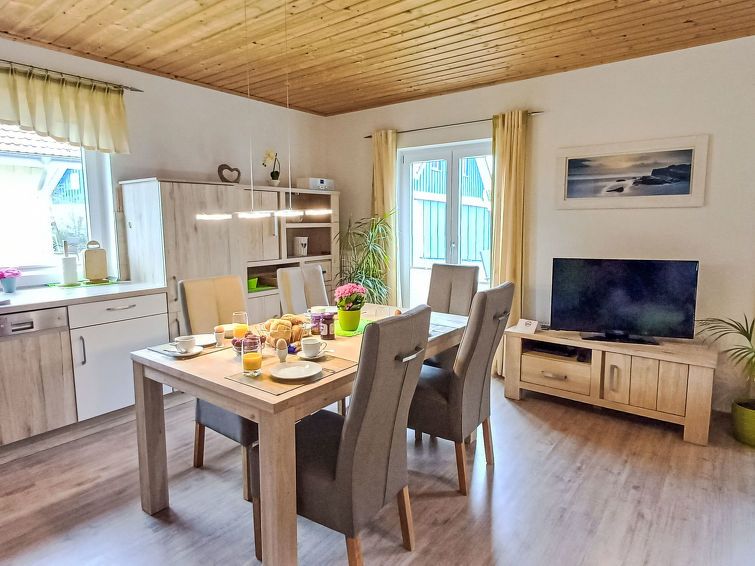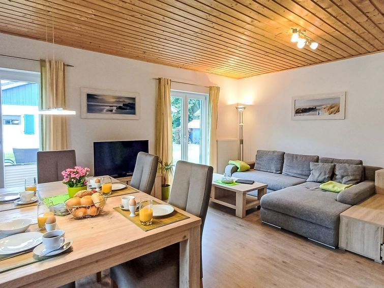 "Inselsommer", 3-room house 62 m2. Bright, tasteful and cosy furnishings: living/dining room with TV, CD-player and DVD. Exit to the garden, to the terrace. 1 room with 2 beds (90 cm, length 200 cm). 1 room with 1 double bed (180 cm, length 200 cm). Kitchen-/living room (oven, dishwasher, toaster, kettle, microwave, freezer, electric coffee machine) with dining table.