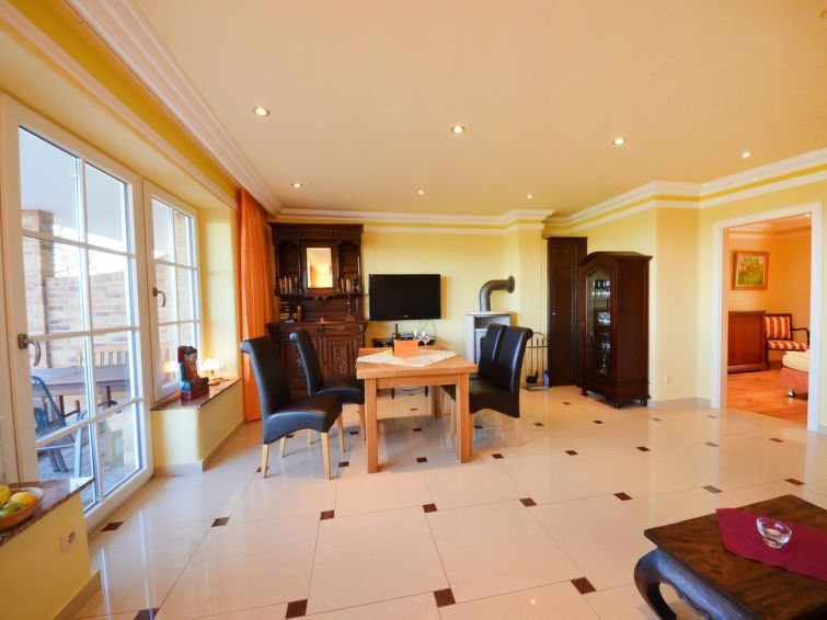 "Sonnenkliff", 2-room apartment 70 m2, on the ground floor. Tasteful furnishings: living/dining room with Scandinavian wood stove, satellite TV, hi-fi system and DVD. Exit to the garden, to the terrace. 1 double bedroom with radio. Open kitchen (oven, dishwasher, microwave, freezer, electric coffee machine).