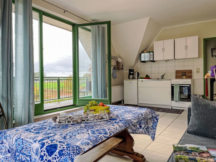 "Kloster Tempzin", 2-room apartment 52 m2 on 1st floor. Partly with sloping ceilings, renovated in 2024, cosy furnishings: living/sleeping room with 1 sofabed (140 cm, length 200 cm), satellite TV (flat screen). Exit to the balcony. 1 room with sloping ceilings with 1 french bed (140 cm, length 200 cm).
