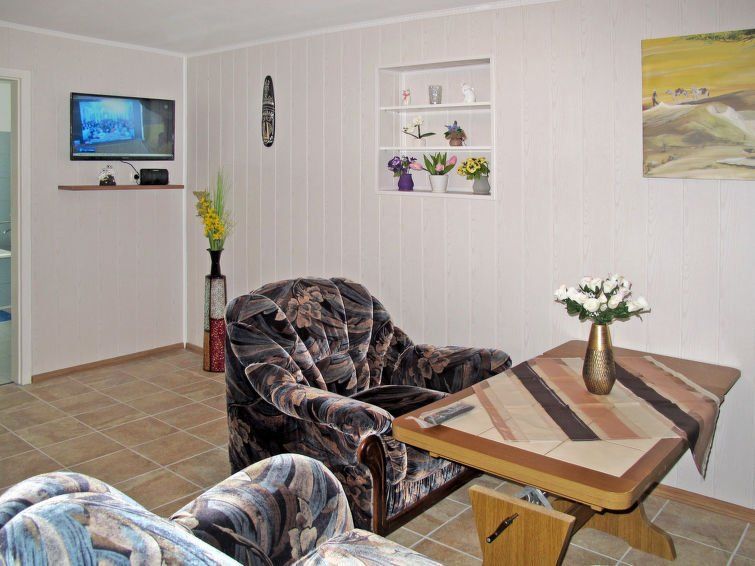 "Am See II", 3-room semi-detached house 65 m2 on 2 levels. Cosy furnishings: living/dining room with satellite TV and radio. Open kitchen (4 hot plates, oven, toaster, kettle, microwave, electric coffee machine). Bath/WC. Oil heating. Upper floor: 1 room with sloping ceilings with 1 french bed (140 cm, length 200 cm).