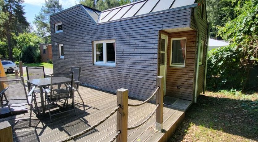 "Tinyhaus 41 Lütt Huus", 1-room mobile home. Object suitable for 2 adults + 1 child. Modern and tasteful furnishings: open living/sleeping room with 1 double bed (180 cm, length 200 cm). Open kitchen (oven, 2 ceramic glass hob hotplates, kettle). Shower/WC. Electric heating. Terrace 15 m2.