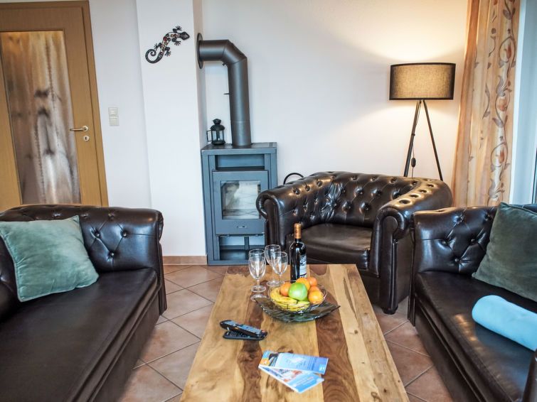4-room house 95 m2 on 2 levels. Cosy furnishings: living/dining room with Scandinavian wood stove, dining table and satellite TV (flat screen). Exit to the terrace. 1 room with 1 double bed (180 cm, length 200 cm). Kitchenette (4 hot plates, oven, dishwasher, toaster, kettle, microwave, electric coffee machine).
