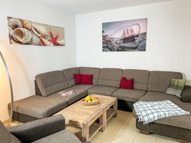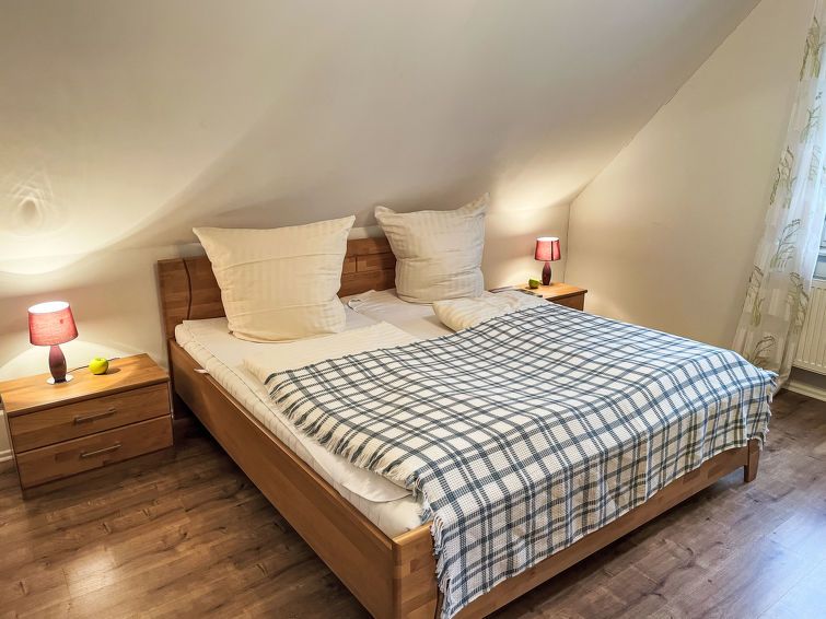 5-room house 100 m2 on 2 levels. Modern furnishings: living/dining room with Scandinavian wood stove and satellite TV (flat screen), radio and CD-player. Exit to the terrace. 1 room with 1 double bed. Kitchenette (oven, dishwasher, 4 ceramic glass hob hotplates, toaster, kettle, electric coffee machine).