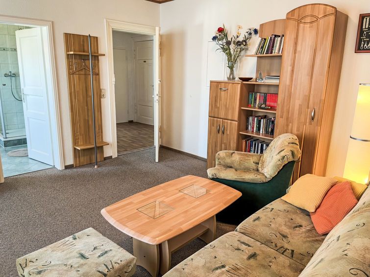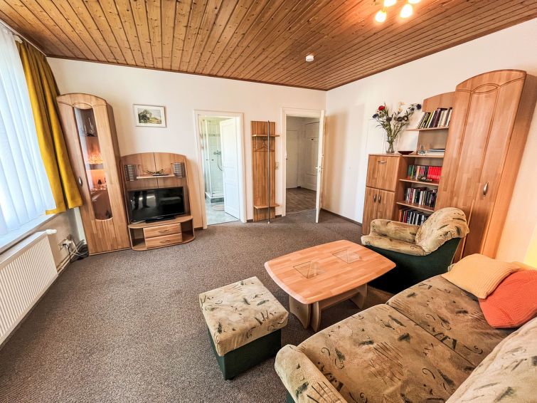 "Burgfried (App. 2)", 2-room apartment 64 m2. Practical furnishings: upper floor: (steep stair) living room with cable TV (flat screen), radio. 1 room with 1 bed and 1 double bed. Kitchen (4 hot plates, oven, toaster, kettle, electric coffee machine) with dining table. Shower/WC. Heating.