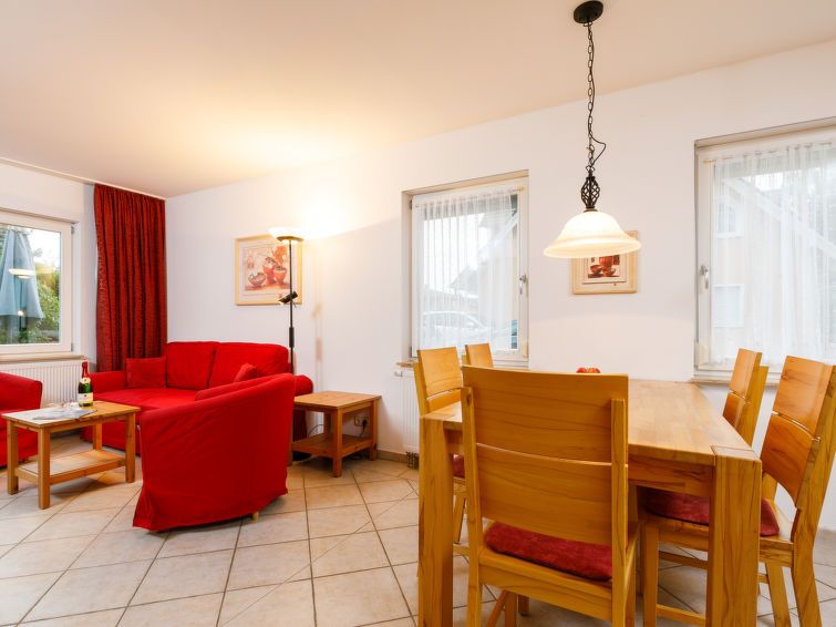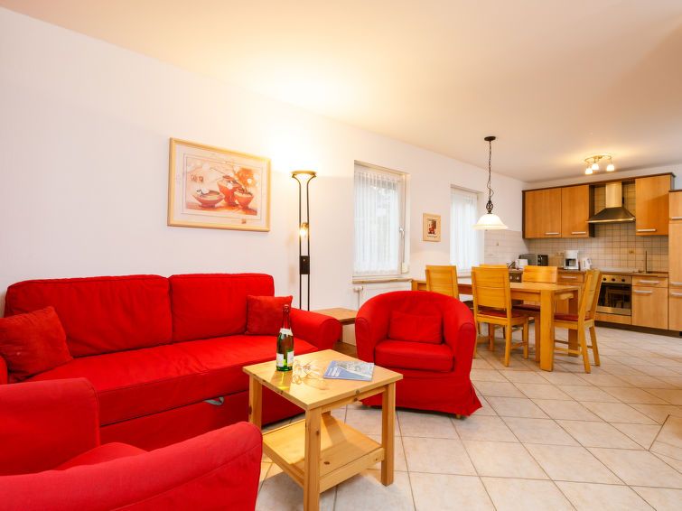 "Conny", 3-room terraced house 78 m2 on 2 levels, on the ground floor. Beautiful and cosy furnishings: living/dining room with 1 double sofabed and cable TV (flat screen), radio. Exit to the terrace. Kitchenette (4 hot plates, oven, toaster, kettle, electric coffee machine). Sep. WC.