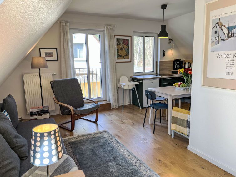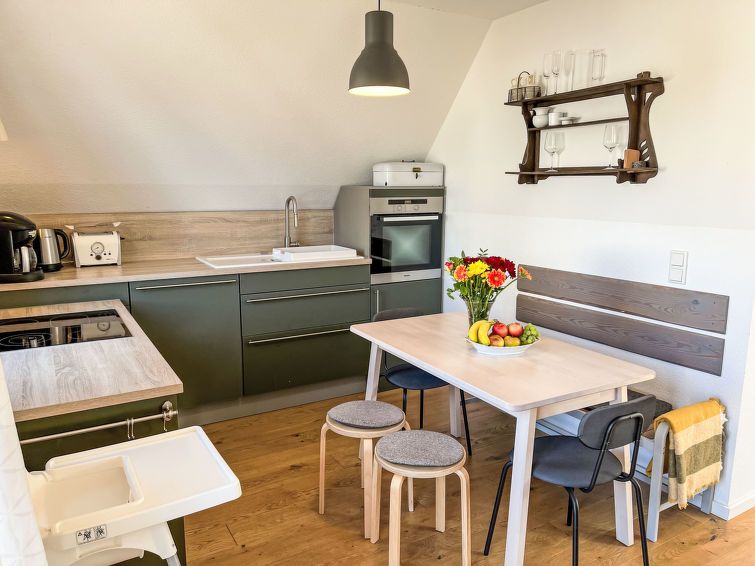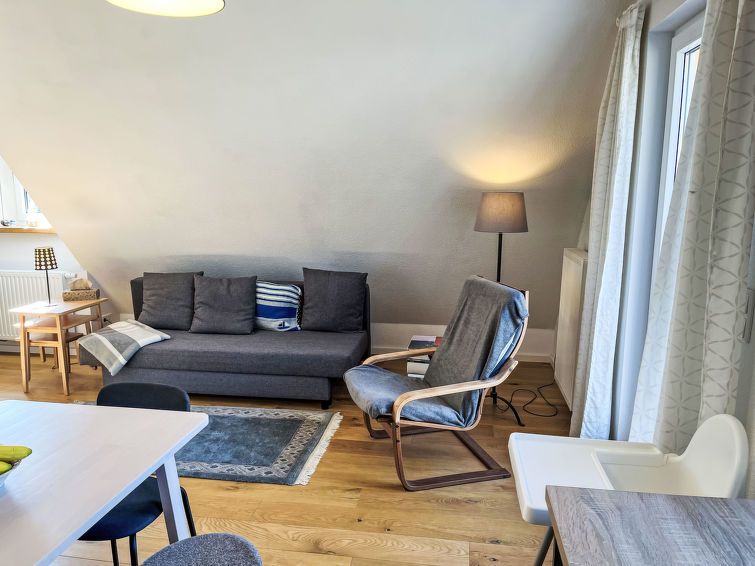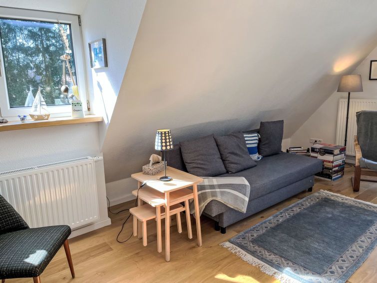 "Obergeschoss", 2-room apartment 53 m2, on the upper floor. Object suitable for 2 adults + 2 children. Bright, partly with sloping ceilings, beautiful furnishings: open living/dining room with sloping ceilings with 1 sofabed (120 cm, length 200 cm), TV (flat screen). 1 room with 1 double bed (180 cm, length 200 cm).