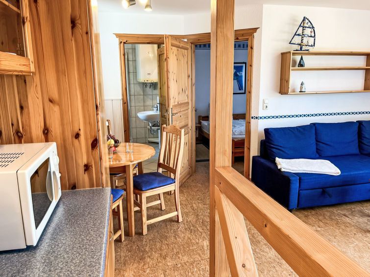 "Emma", 2-room bungalow 34 m2. Object suitable for 2 adults + 1 child. 1 room with dining table, kitchen corner and satellite TV (flat screen), radio. Exit to the terrace. 1 room with 1 double bed (180 cm, length 200 cm). Kitchen-/living room (2 hot plates, toaster, kettle, microwave, electric coffee machine).