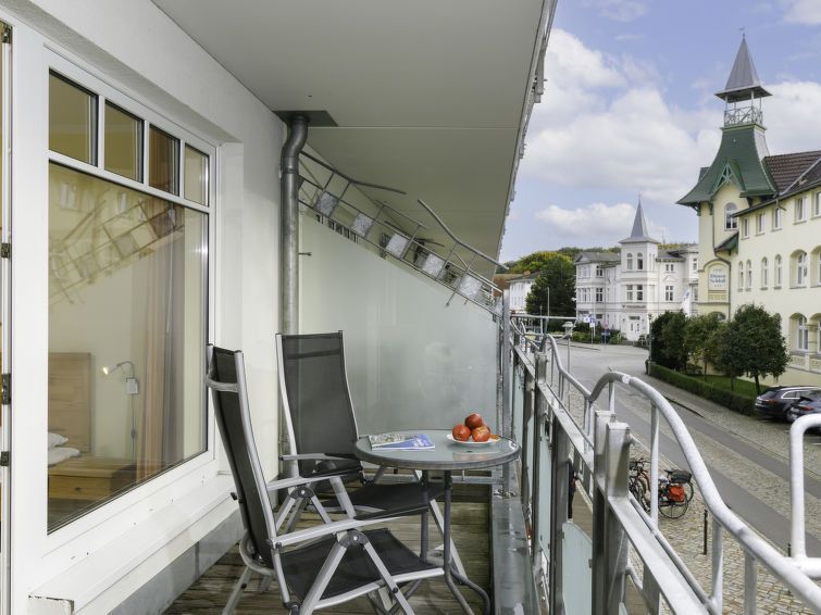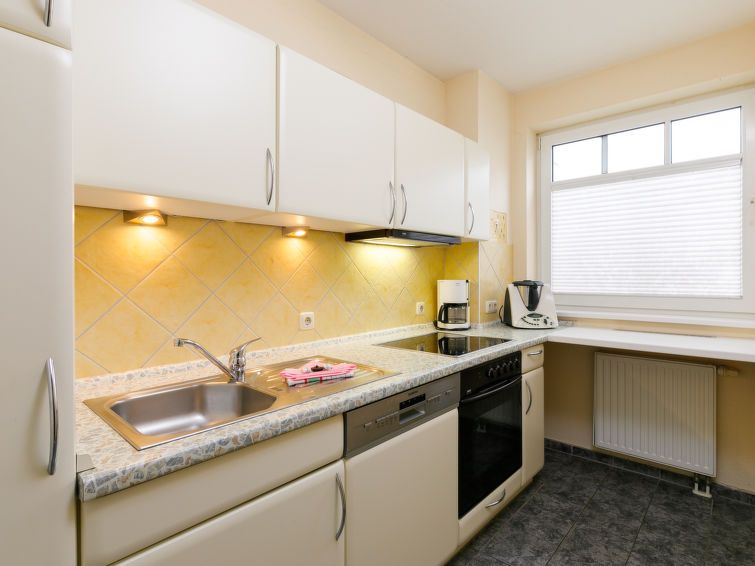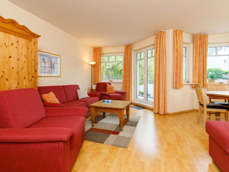 "Luise von Preußen (App.101)", 3-room apartment 73 m2 on 1st floor. Bright, comfortable furnishings: living/dining room with Scandinavian wood stove and cable TV (flat screen), hi-fi system. 1 room with 1 double bed and cable TV (flat screen). Exit to the balcony. 1 room with 1 pull-out bed (2 pers.