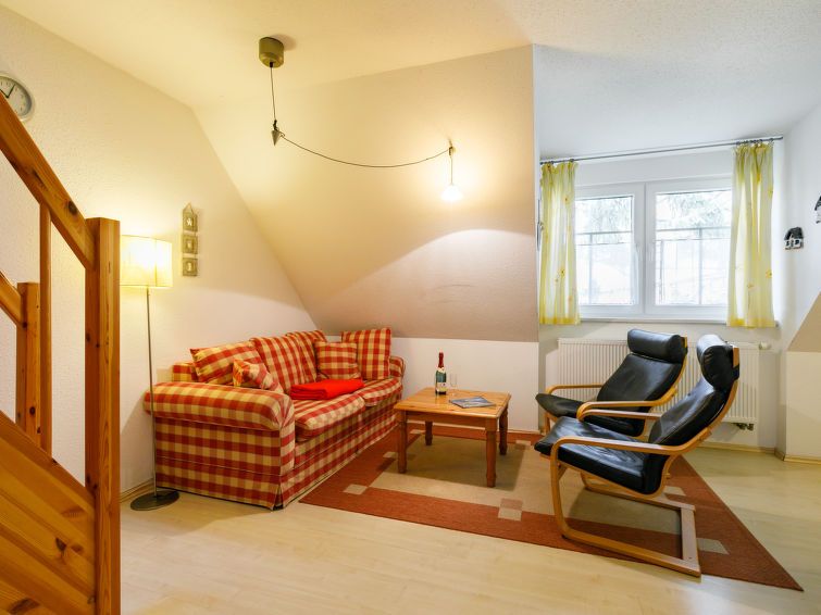 4-room terraced house 115 m2 on 3 levels, on the ground floor. Simple furnishings: living/dining room with 1 sofabed and cable TV (flat screen), radio. Exit to the terrace. 1 room with 1 double bed. Kitchenette (4 hot plates, oven, dishwasher, toaster, kettle, electric coffee machine).