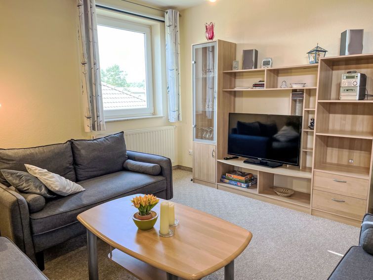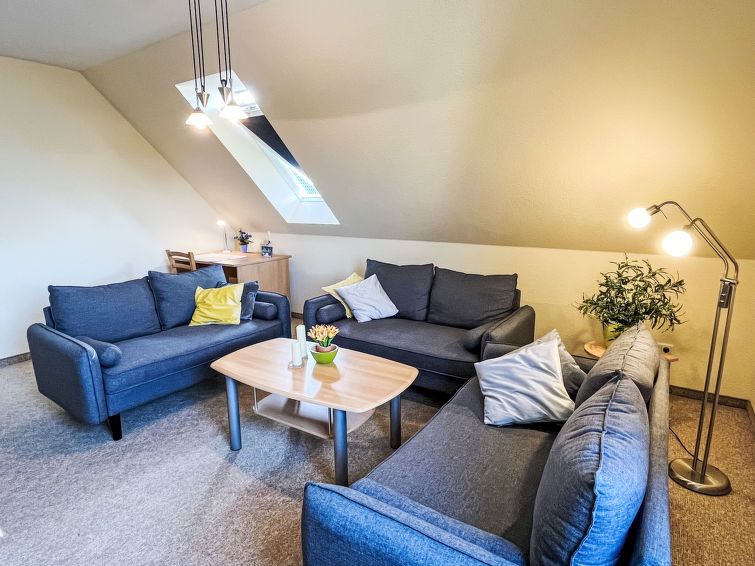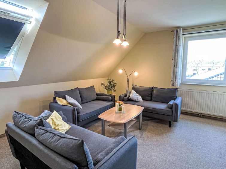 "Sandbank", 4-room apartment 97 m2 on 2 levels on 1st floor. Cosy furnishings: living room with sloping ceilings with cable TV (flat screen), radio. 1 room with sloping ceilings with 1 double bed. Open kitchen (oven, dishwasher, 4 ceramic glass hob hotplates, toaster, kettle, microwave, electric coffee machine) with dining table.