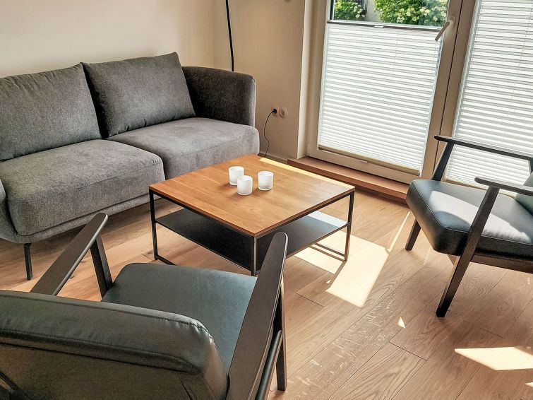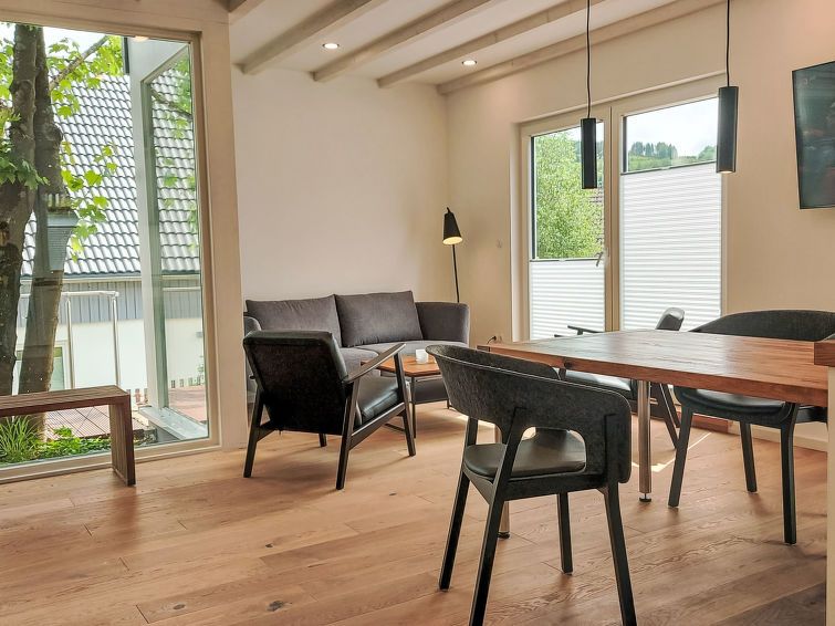 3-room house on 2 levels. Spacious and bright, very modern and tasteful furnishings: living/dining room with satellite TV (flat screen). Exit to the terrace. Open kitchen (dishwasher, 4 ceramic glass hob hotplates, toaster, kettle, microwave, freezer). Shower/WC, Sauna. Upper floor: 1 room with 1 double bed and satellite TV (flat screen).