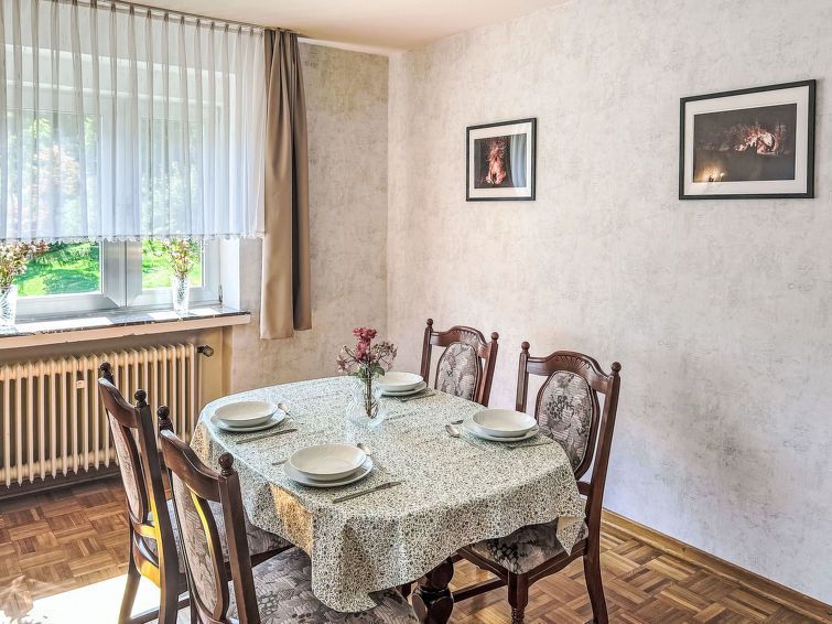 "Celine", 3-room apartment 90 m2 on 1st floor. Cosy furnishings: living/dining room with dining table and cable TV (flat screen), hi-fi system. Exit to the balcony. 1 room with 1 double bed (180 cm, length 200 cm). 1 room with sloping ceilings with 2 beds (90 cm, length 200 cm). Kitchen (oven, dishwasher, 4 ceramic glass hob hotplates, toaster, kettle, microwave, freezer, electric coffee machine) with dining table.