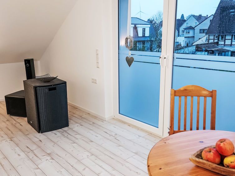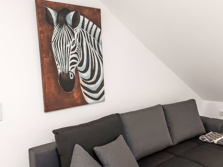 "Lindenstraße", 2-room apartment 55 m2, on the top floor. Renovated in 2024, modern and cosy furnishings: living/dining room with sloping ceilings with 1 sofabed, satellite TV and flat screen. Exit to the balcony. With sloping ceilings, 1 room with 1 double bed. Kitchenette (2 hot plates, toaster, kettle, microwave, freezer, electric coffee machine) with dining table.