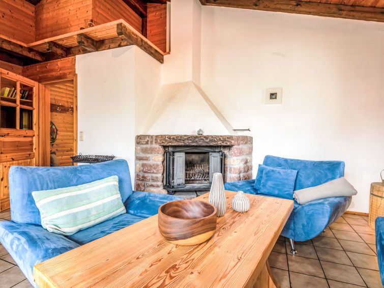 3-room apartment on the upper floor. Cosy and wooden furniture furnishings: living/dining room 40 m2 with open-hearth fireplace and satellite TV. Exit to the balcony. 1 room 11 m2 with 1 double bed (180 cm, length 200 cm). 1 room 5 m2 with 1 x 2 bunk beds (90 cm, length 200 cm). Kitchenette (4 hot plates, oven, toaster, kettle, electric coffee machine).