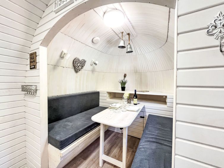 "Tiny Haus Vierseenblick Nummer 1", 1-room mobile home 20 m2, on the ground floor. Beautiful and cosy furnishings: living/sleeping room with 1 double bed (2 x 100 cm, length 200 cm), dining nook. Exit to the terrace. Small kitchenette (2 hot plates, toaster, kettle, electric coffee machine).