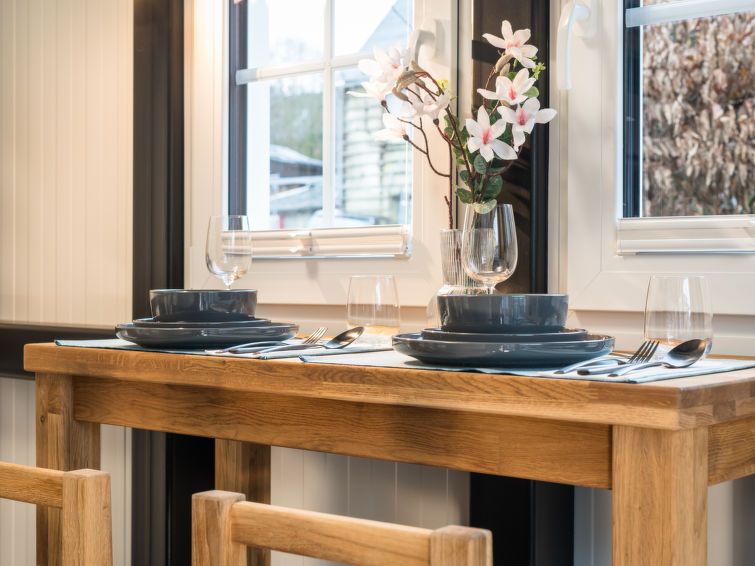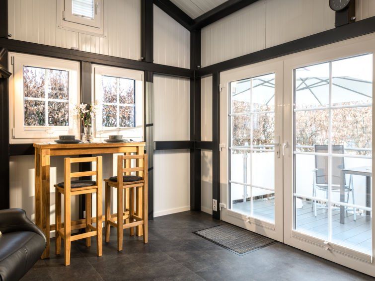 "Tiny Haus Westerwald 16 Blue", 1-room house 28 m2. Modern and cosy furnishings: living/dining room, on 2 levels with TV. Exit to the balcony. Open gallery with sloping ceilings, ceiling height 1 - 120 cm, without wardrobe with 1 double bed (160 cm, length 200 cm). Kitchenette (2 ceramic glass hob hotplates, toaster, kettle, electric coffee machine).