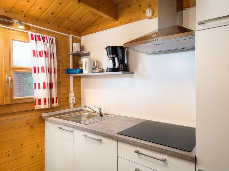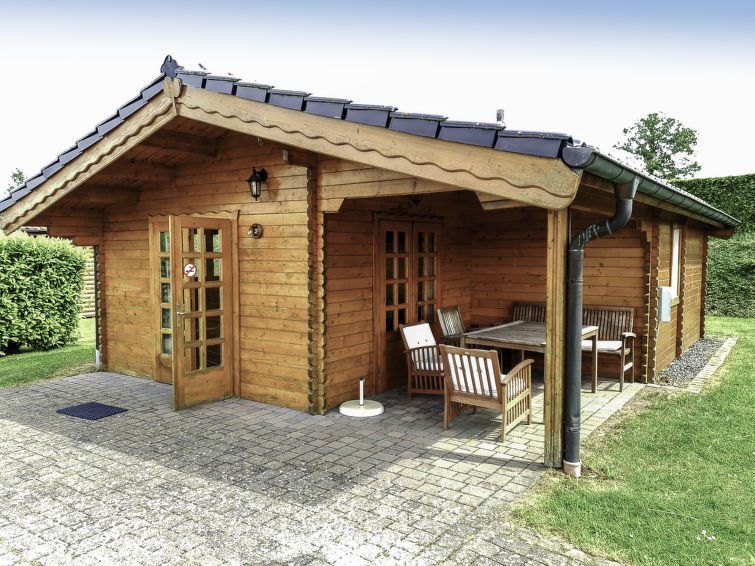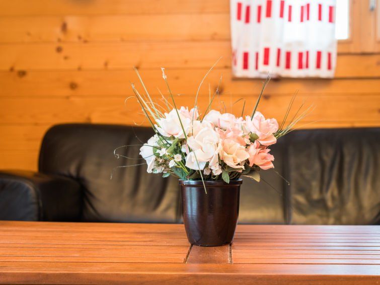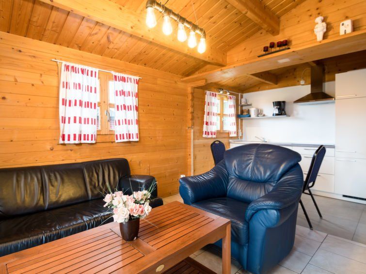 "Holzchalet E", 3-room bungalow 52 m2. Cosy furnishings: living/dining room 28 m2 with satellite TV (flat screen). Exit to the terrace. 1 room 6 m2 with 1 double bed (160 cm, length 190 cm). 1 room 6 m2 with 1 x 2 bunk beds (80 cm, length 190 cm). Kitchenette (4 ceramic glass hob hotplates, microwave, electric coffee machine) with small bar.