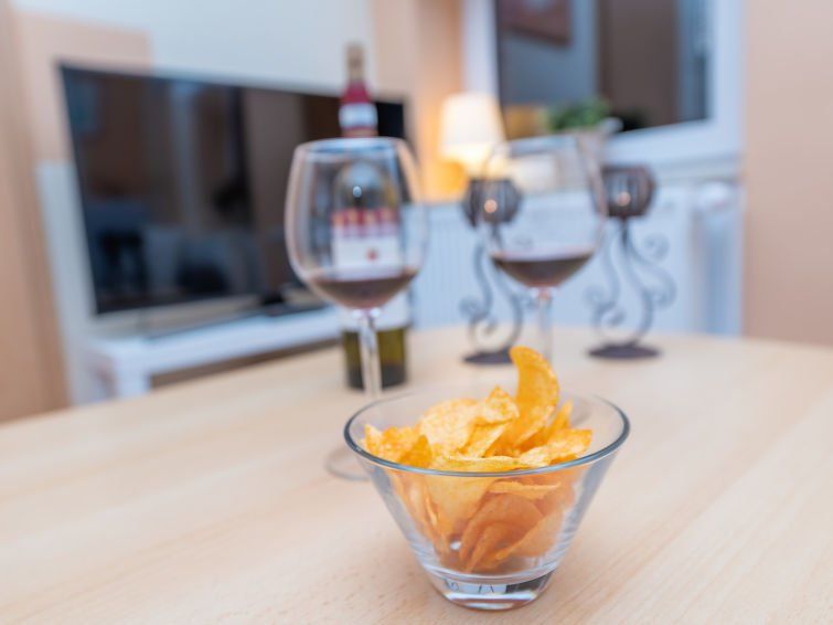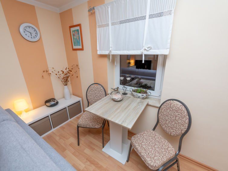2-room apartment 30 m2, on the upper floor. Beautiful and cosy furnishings: living/dining room with dining table and satellite TV. 1 double bedroom. Kitchenette (4 hot plates, oven, dishwasher, toaster, kettle, electric coffee machine). Shower/WC. Gas heating. Facilities: baby cot.