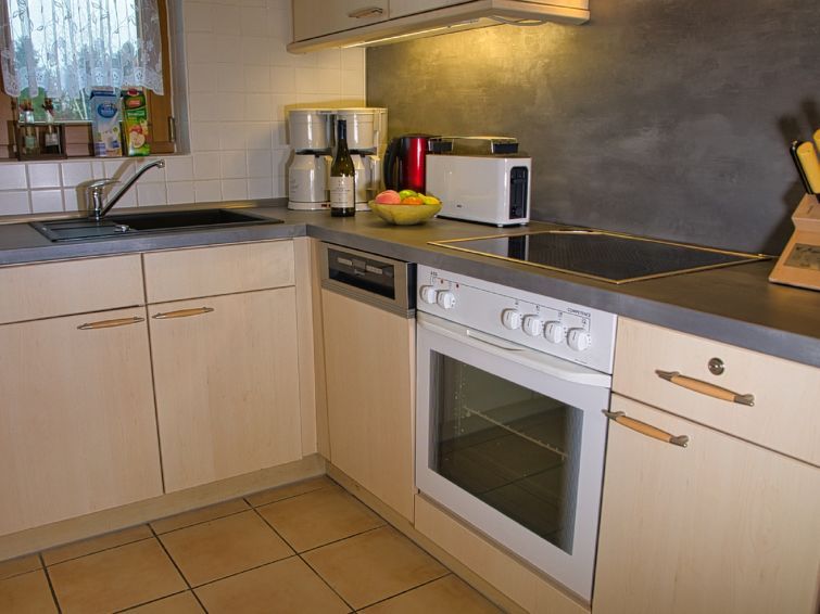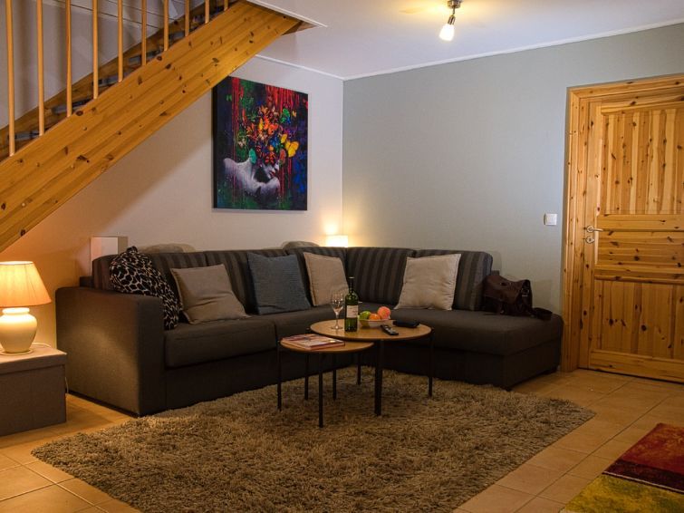 3-room semi-detached house 76 m2 on 2 levels. Cosy and wooden furniture furnishings: living room with dining table, satellite TV and hi-fi system. Exit to the terrace. Open kitchen (oven, dishwasher, 4 ceramic glass hob hotplates, microwave, electric coffee machine). Sep. WC. Upper floor: with sloping ceilings, 1 room with 1 double bed.