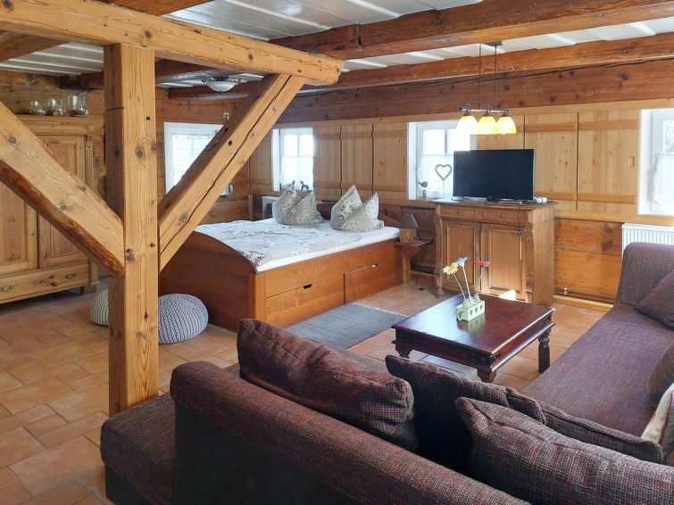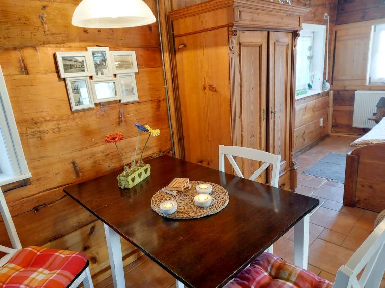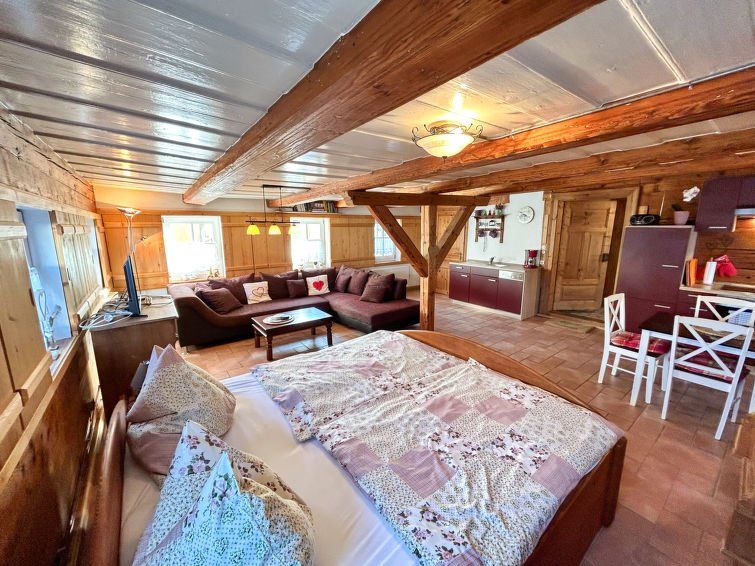 "Blockstube", 1-room apartment 48 m2, on the ground floor. Cosy and wooden furniture furnishings: living/sleeping room 36 m2 with 1 sofabed and 1 double bed (180 cm, length 200 cm), cable TV (flat screen). Kitchenette (oven, dishwasher, 4 ceramic glass hob hotplates, toaster, kettle, electric coffee machine) with dining nook.