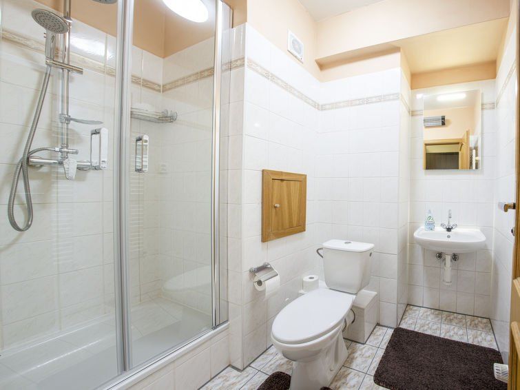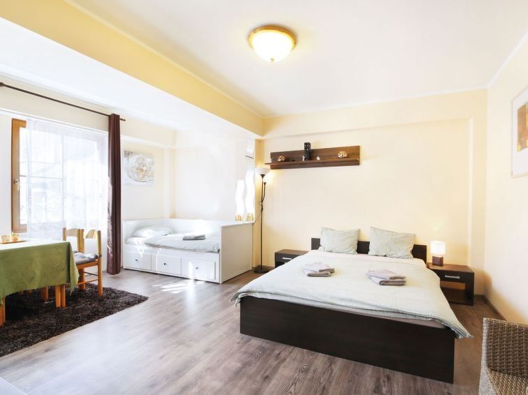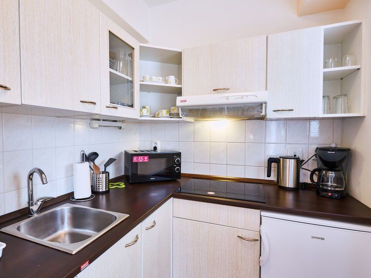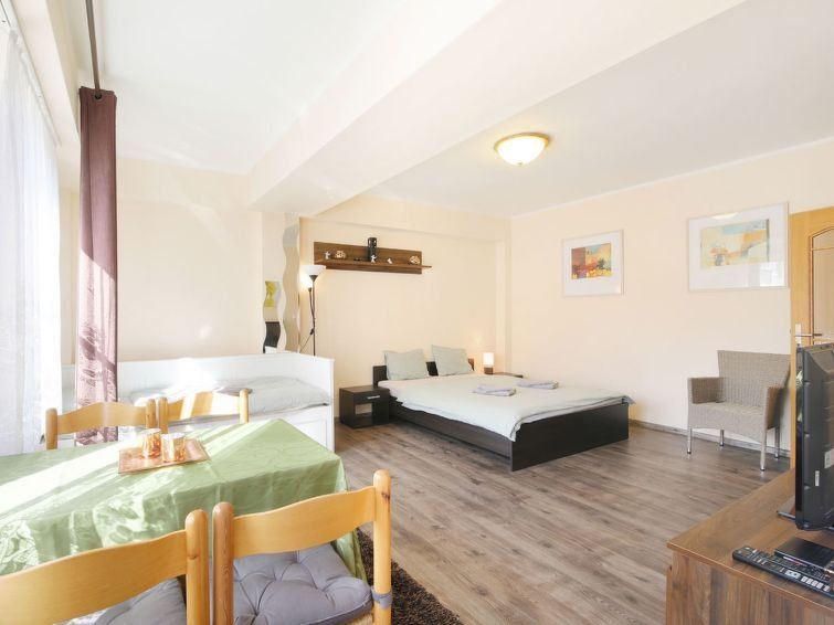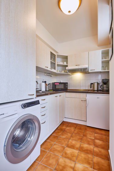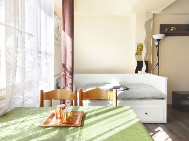 1-room apartment 34 m2 on 3rd floor. Modern and cosy furnishings: entrance hall. Living/sleeping room with 1 double sofabed, 1 double bed, dining table and satellite TV. Small kitchen 4 m2 (4 hot plates, microwave). Shower/WC. Small balcony. Side view of the forest. Facilities: washing machine.