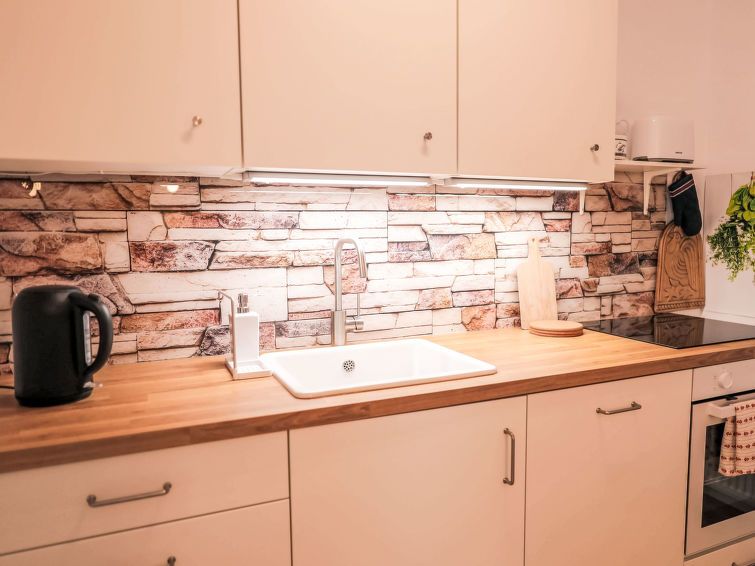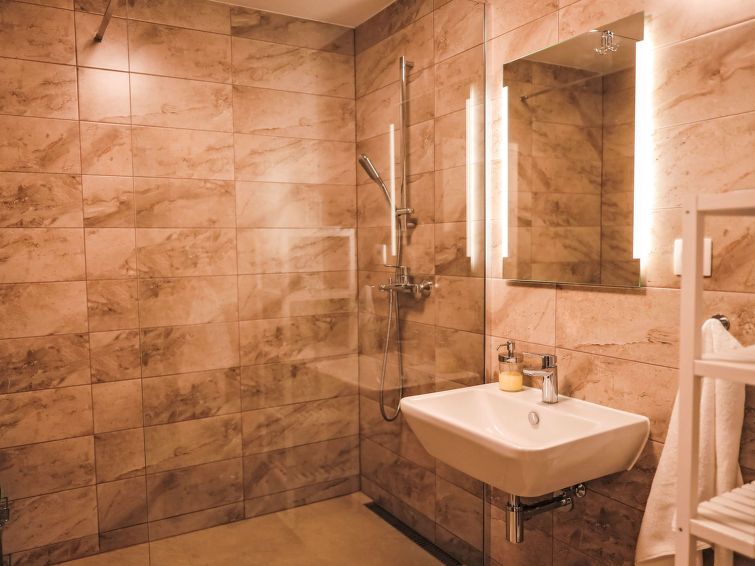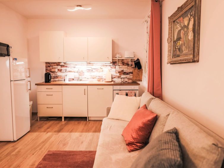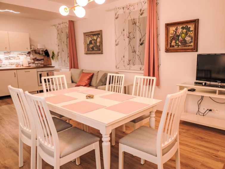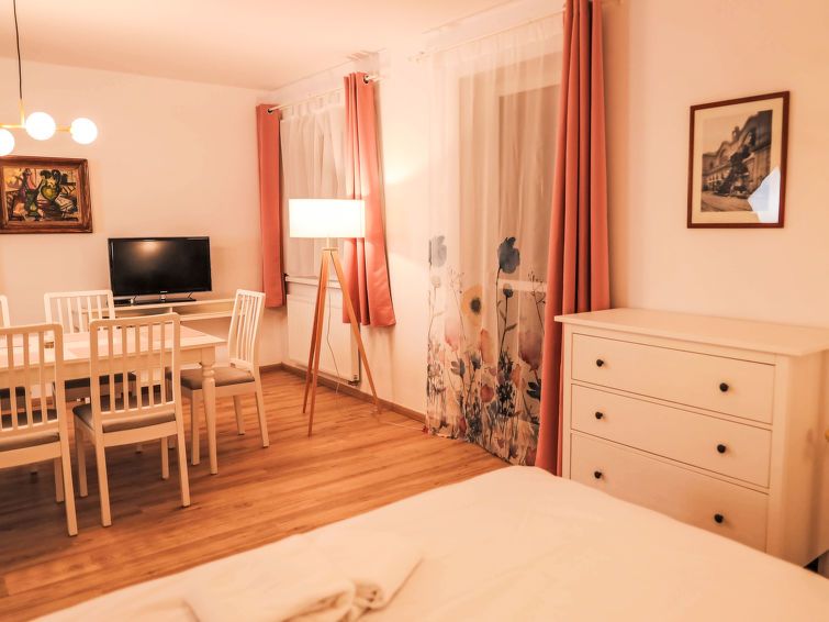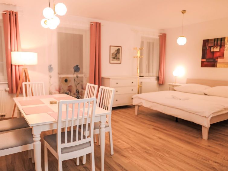 "Proton", 2-room apartment 70 m2. Large living/sleeping room with 1 double sofabed, 1 double bed and TV. Exit to the balcony. 1 room with 2 beds. Kitchenette (oven, dishwasher, 4 ceramic glass hob hotplates, toaster, kettle, microwave, freezer). Shower/WC. Electric heating. View of the countryside.