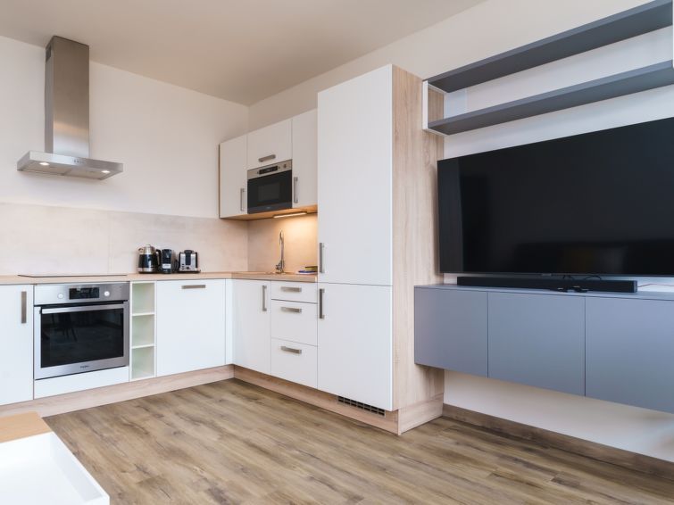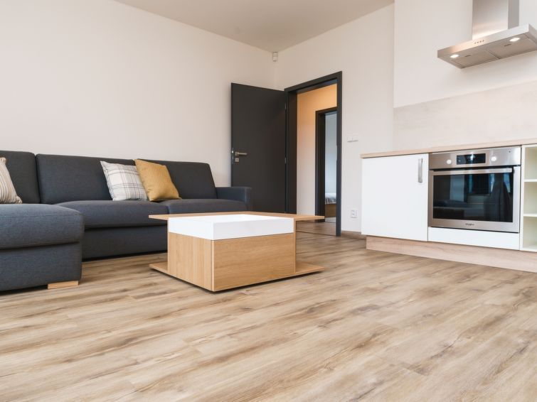 "Simba Klínovec", 3-room apartment 68 m2 on 1st floor. Living room with 1 double sofabed. 1 room with 1 double bed. 1 room with 1 double bed. Kitchenette (oven, dishwasher, microwave, electric coffee machine) with dining table and TV. Exit to the balcony. Shower, sep. WC. Balcony.